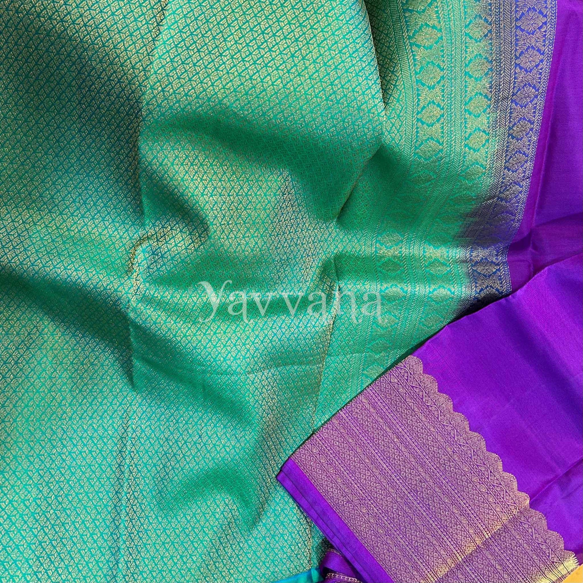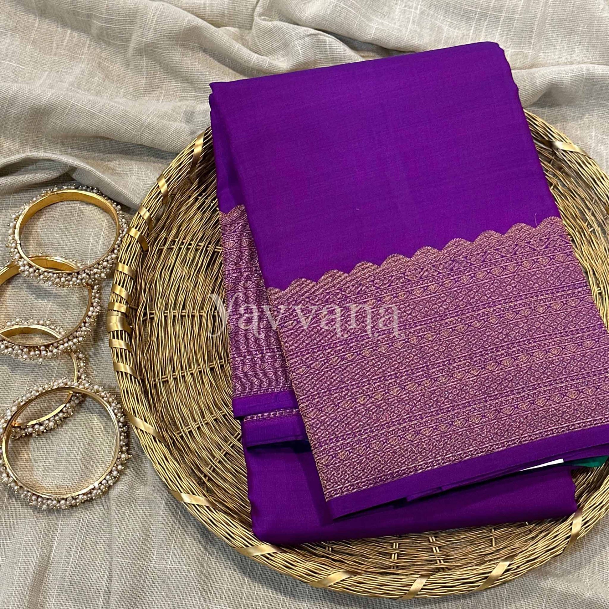 Make a statement of regal elegance with this stunning royal violet silk saree, intricately made with golden border. The saree features plain shiny look throughout the body, complemented by a heavily embellished traditional border and pallu that exude grandeur.